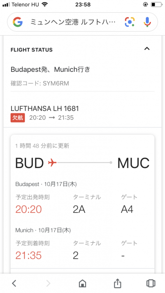 少し不安になって、改めてフライト確認アプリを使って確かめてみました。ブダペスト発ミュンヘン行きのルフトハンザ機に乗る予定なので、飛行機はミュンヘンから飛んできてそのまま折り返すはず、ということで、ブダペストに飛んでくる飛行機を調べてみたら、