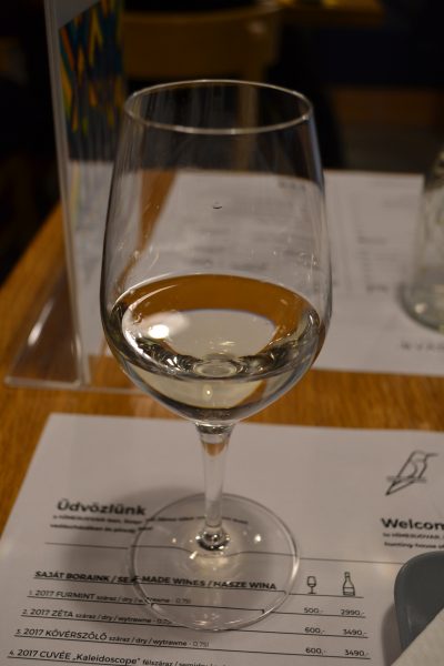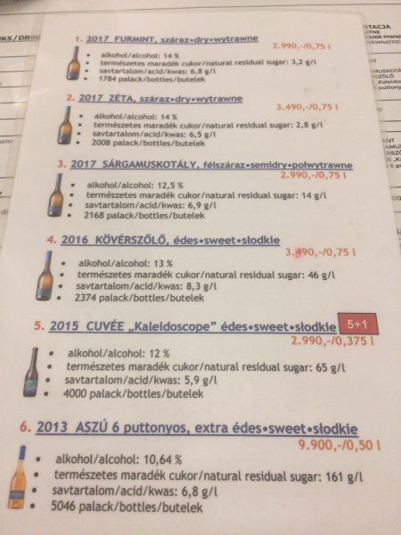 飲み比べは、30mL×5種類で2000フォリント(約800円)か、50mL×6種類で3000フォリント(約1200円)か、の2種類です。なお、ハンガリーではdl(デシリットル)の単位が未だに使われていて、ワインだと「0.1dl(=100mL)」という表記が一般的となっています。dl=100mLで、グラスワインで多いのは1dLいくら、というものです。