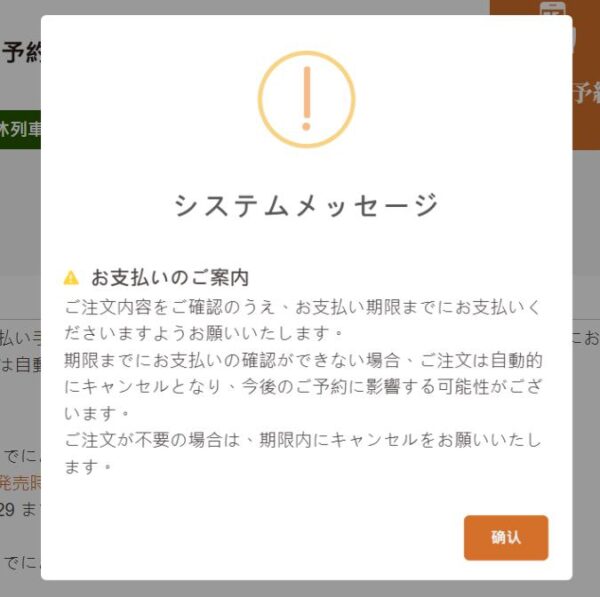 座席の選択ができたら、決済に進みます。上の画面で、一番左の「○」をクリックして「確認する」をクリックして先に進むと、