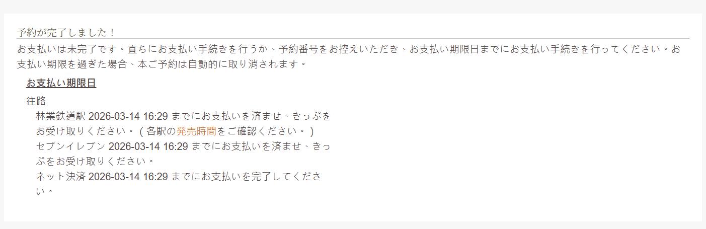 この画面になれば、カード番号を入力して決済に進んで、無事に予約と購入が終わりました。