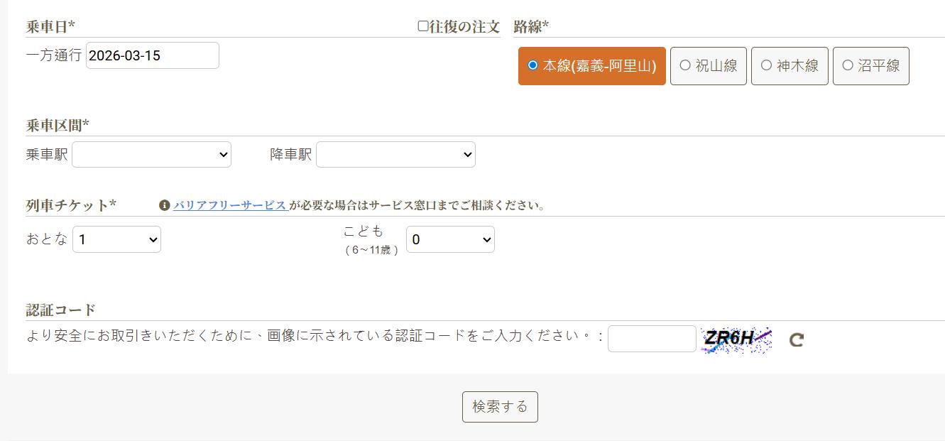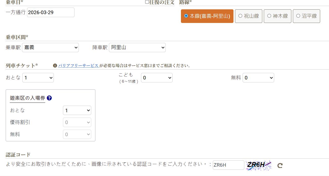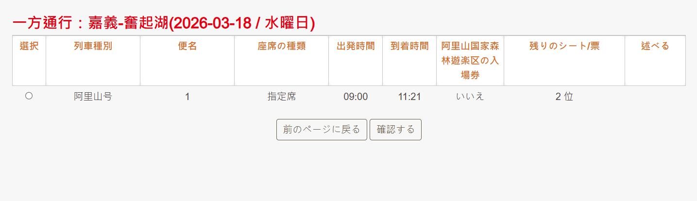 3月15日から一番先の、3月29日で、大人一名、嘉義から阿里山までの区間を選択しました。
