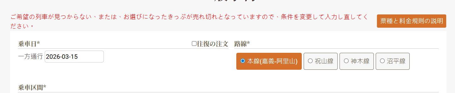 また、日付の右には、区間(本線、祝山線、神木線、沼平線)も選ぶことができるようになっているので、祝山の日の出列車などもこのページで予約することができます。