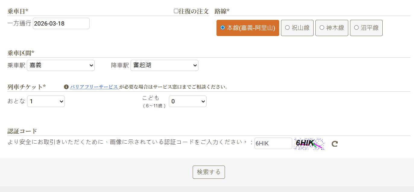 この記事では、代替便としての、嘉義→奮起湖のチケットの取り方を、写真と共に解説します(操作方法自体は同じなので、空きさえあれば、嘉義→阿里山、または阿里山→嘉義のチケットも予約できます)。