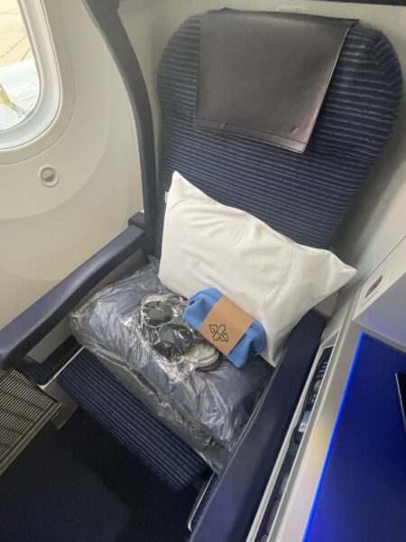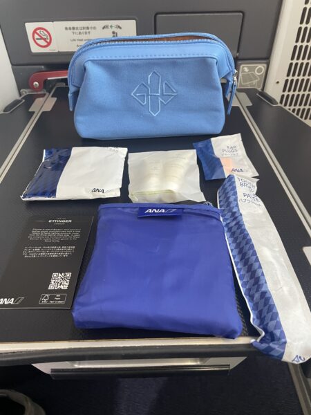 搭乗時に、座席には枕、ブランケット、ベッド用マットレス、イヤホン、アメニティポーチが置かれていました。