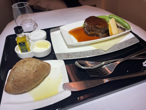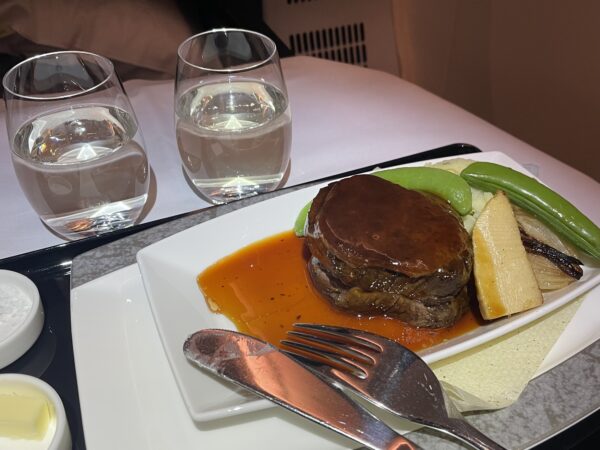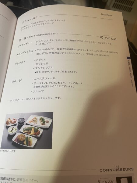 私は、1回目は、日本酒の飲み比べをしたいので洋の肉を、2回目は、当分食べられないであろう和をチョイスしました(事前予約サービスを使って、搭乗前に指定しました)。