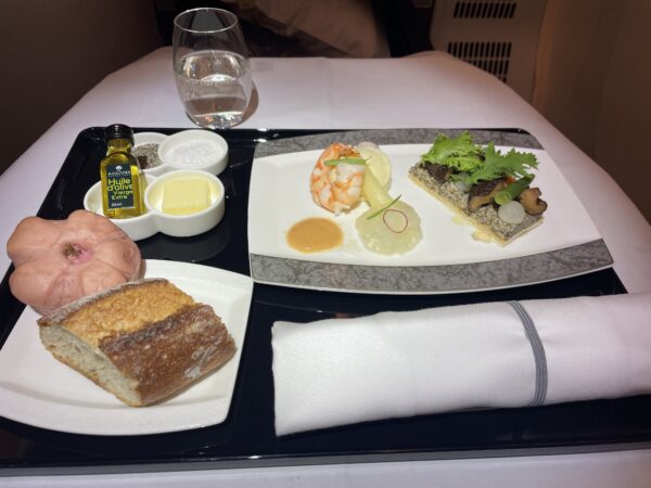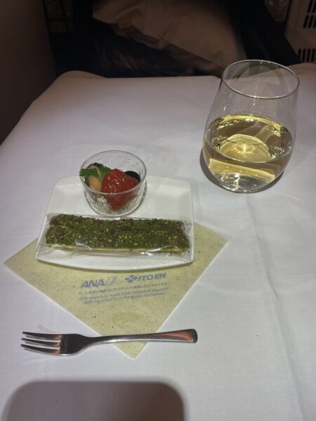 まずはアミューズとして、「ANAオリジナル抹茶アーモンドパイスティックと、ムール貝のマリネ/チーズとオリーブ」がサーブ。