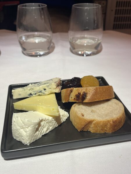 続いては、デザート。「ムーステヴェール/チーズ(フレッシュ、セミハード、ブルー)/フルーツ」でしたが、既にお腹がいっぱいだったので、チーズのみいただき、お酒に合うドライフルーツとブレッドを付けてもらいました。