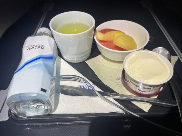 その後、フルーツを、ハーゲンダッツアイス(いつでも頼める軽食)と合わせて出していただき、これらを口にしてから仮眠を取ることに。