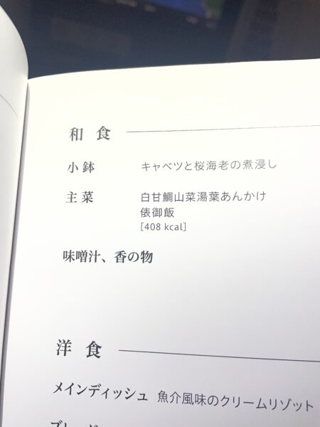 合計2回の食事が出て、1回目は和と、洋の肉/魚から選べ、2回目は和と洋から選べます。