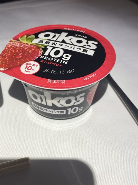 おにぎりは、日本食の当面の食べ納めとして、ヨーグルトは、毎朝食べているのと同じ目的で、整腸のためです。