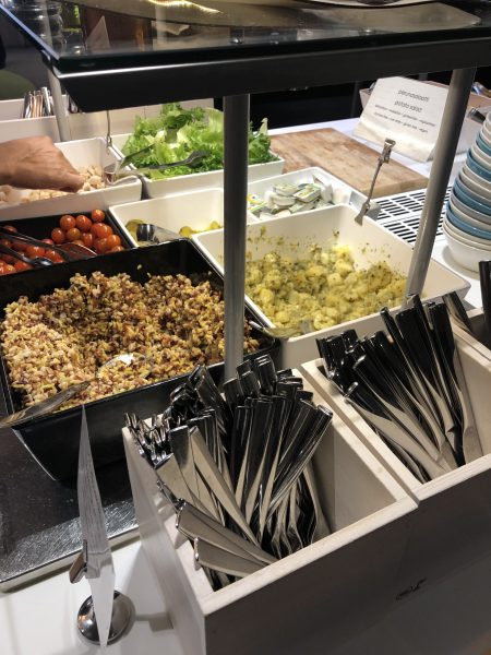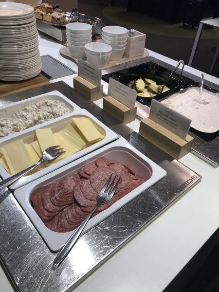シリアル、サラダ(トマトなど)、ポテトといった、あくまで軽めの食事のみ。ただ、ヘルシンキ経由で他のヨーロッパ主要都市に更に向かう場合、エコノミークラスだとサンドイッチのような軽食しか出ず、フライト時間も2時間前後、現地到着が夜遅くなる場合もあるので、できればヘルシンキのこのラウンジで、食べられるものは食べておいたほうがお腹にとってはいいかもしれません。