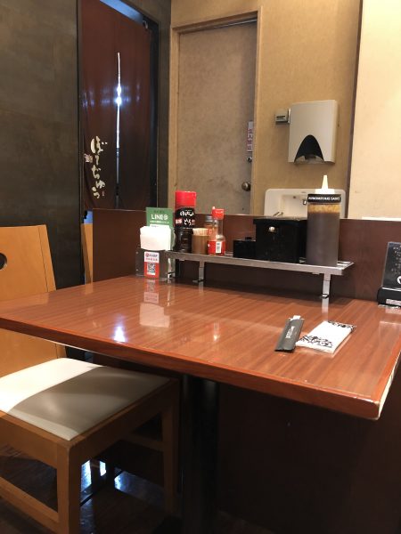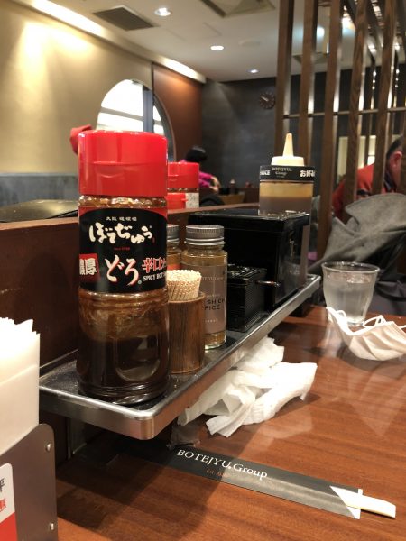 テーブル横にある、ソースや鰹節が置かれている棚。これも、モーニング利用時に使うことはほぼなさそうです。