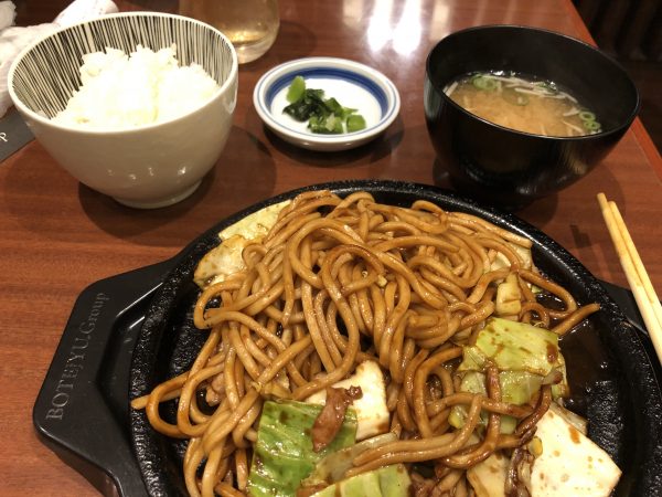これに、ご飯と味噌汁が付くんですが、正直言ってご飯は余計かな…。自分の胃だと、焼きそばと味噌汁だけで十分です。