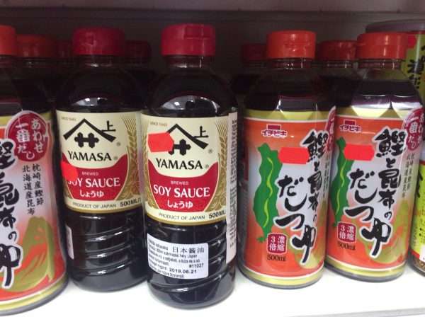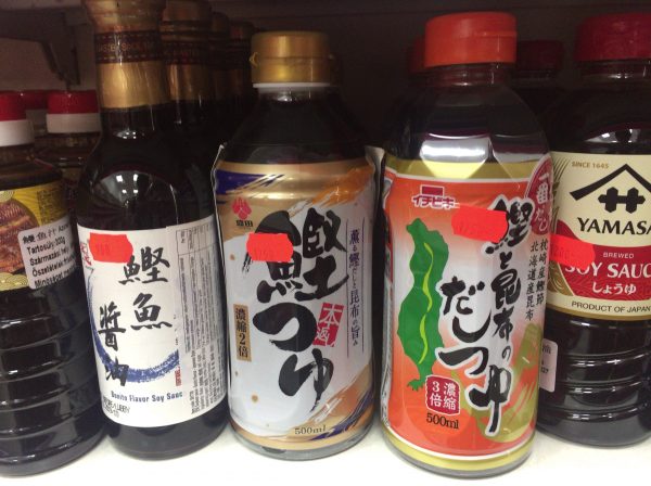 ダシつゆの隣にはお醤油が。ただ、これはお寿司屋さんで使うのがメインでしょうか…。海外生活で自炊をするときに、あまり醤油は使わなかったので。