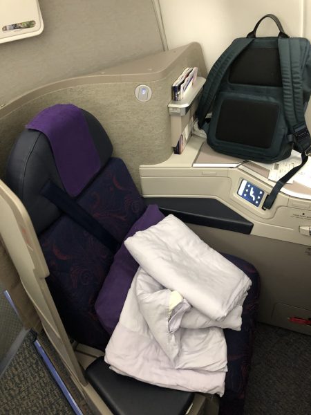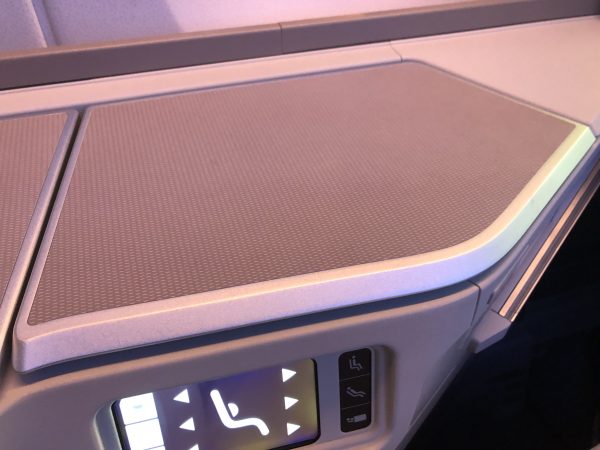 ビジネスクラスの座席配置は、航空会社や機材によって色々あるようですが、今回利用したエアバス350では、窓側に1つ、中央に2つの、横一列で4席が並ぶ座席配置となっていました。
