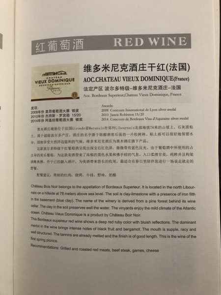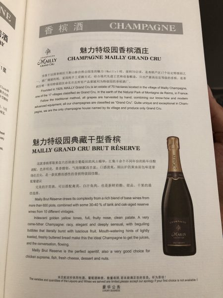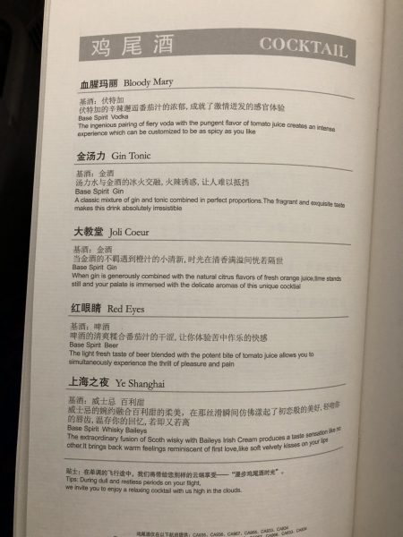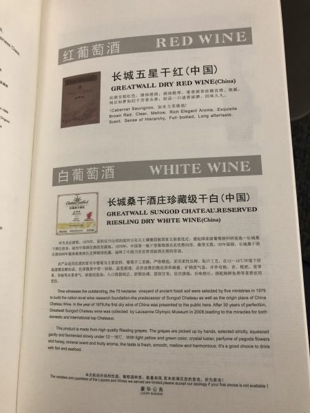 ワインリストには、中国のものも含まれているからか、往路で利用したルフトハンザのそれよりもバラエティは豊富でした(ちなみに、CAさんが薦めていたのは本場フランスのワインでしたが…)。