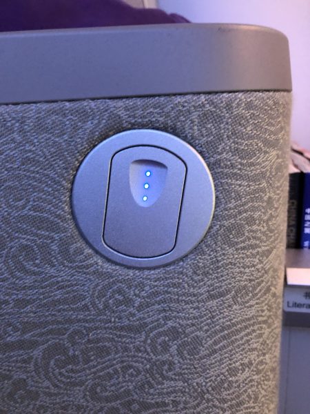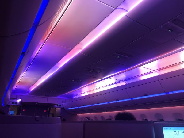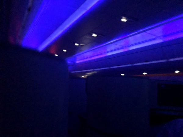完全消灯が終わると、機内は紫色の不思議な色に照らされて、やがて朝食の準備が進んでいく、という感じでした。