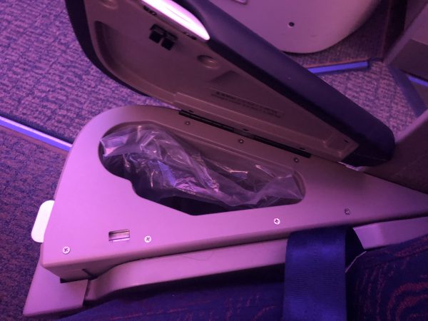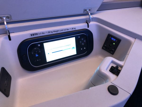 そして、座席リクライニングの操作画面の上にもスペースがあり、この中にスクリーンの操作卓と、USBハブが収納。ここにスマホを置いて充電することもできます。