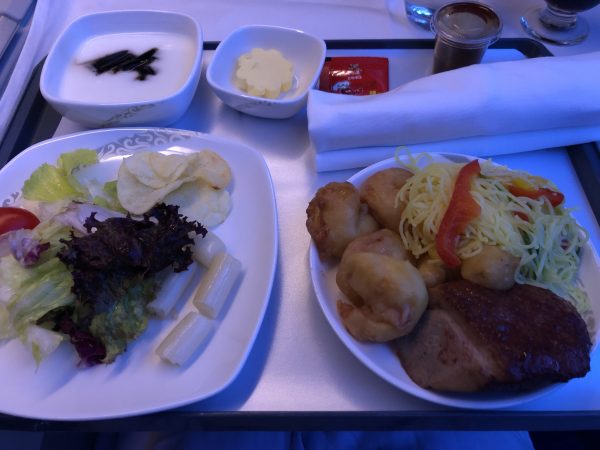 ミールは、乗り継ぎ客が多いことも踏まえてなのか、欧米系のものもある程度用意されていました。が、味付けが中国スタイルなので、好みは分かれると思います。