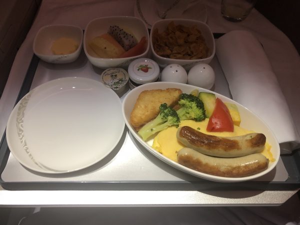 着陸2時間ほど前から朝食のサーブが開始。中国料理と西洋料理で選べたので、ここは迷わず西洋料理にしました。目的地のドイツらしく(?)ソーセージとオムレツが入っていました。
