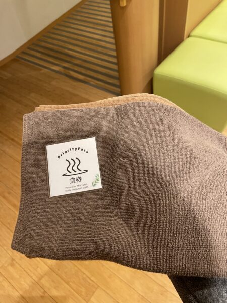 温泉は、通常利用の場合は、「タオルあり/なし」を選べて料金が違っていますが、プライオリティパス利用の場合は、バスタオルとハンドタオルの2枚を貸してもらえました。