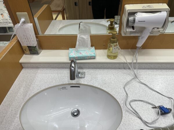 洗い場には、シャンプー、リンス、ボディソープはありましたが、洗顔クリームなどはありませんでした。顔周りのケアに必要な化粧品類は持参したほうが良さそうです。