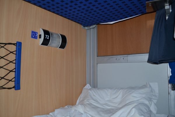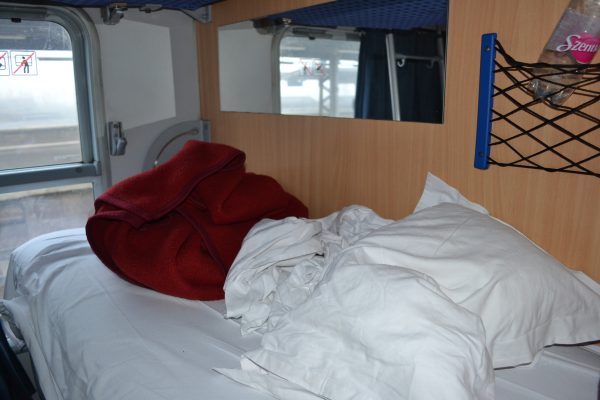 読書灯はありますが、カーテンがないので隣の人が使うとそれはそれで明るく、これまた不便。日本の開放寝台にはベッド毎に仕切りのカーテンがありましたが、このクシェットには個室内と個室外の窓にしかカーテンがないのが、不便と言えば不便ですね。アイマスクを持っていったほうがいいでしょう。