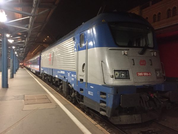 ブダペストからの牽引機は、チェコ国鉄の電気機関車。実はこのユーロナイト、チェコの途中の駅までは「プラハ行きユーロナイト」も連結していて、その駅(オストラバ?)で切り離して、ワルシャワとプラハを目指すという運行形態を取っています。