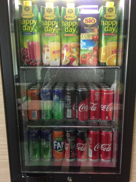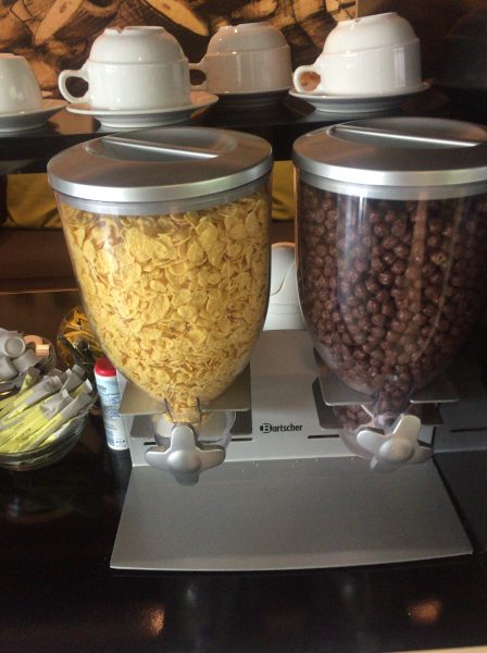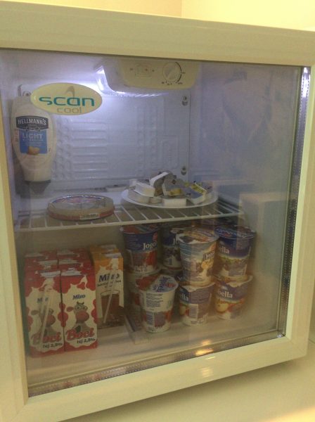 なお、このラウンジで不便な点の1つに、シリアル用の牛乳が、この冷蔵庫の中にある紙パックのものであることがあります。