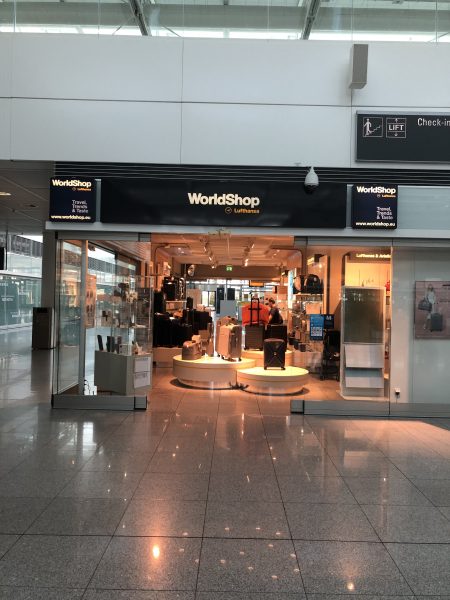 ミュンヘン空港は、出発カウンターのある地上階(上の、掲示板の場所からすぐ右)に1店舗、保安検査・国境審査を終えた後の制限区域内に2~3店舗あったはずですが、機内持ち込みサイズを超えるスーツケースを買う場合は、この保安検査前にあるワールドショップで購入して、そのまま免税手続きをしてカウンターで預ける必要があるので注意しましょう。