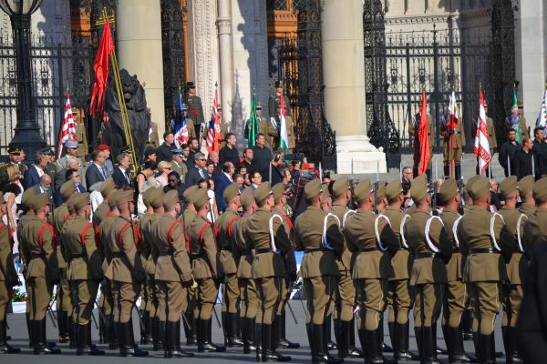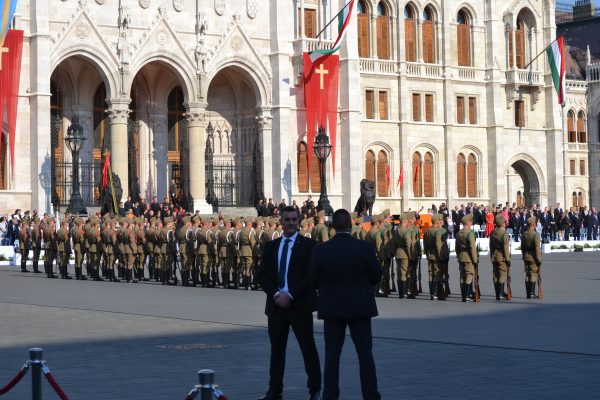 建国記念日のハイライトは、実は朝一にやってきます。それが、国会議事堂前の広場で行われる記念式典。ハンガリー語で司会が進行しながら、歌を歌ったり国旗を掲揚したりします。