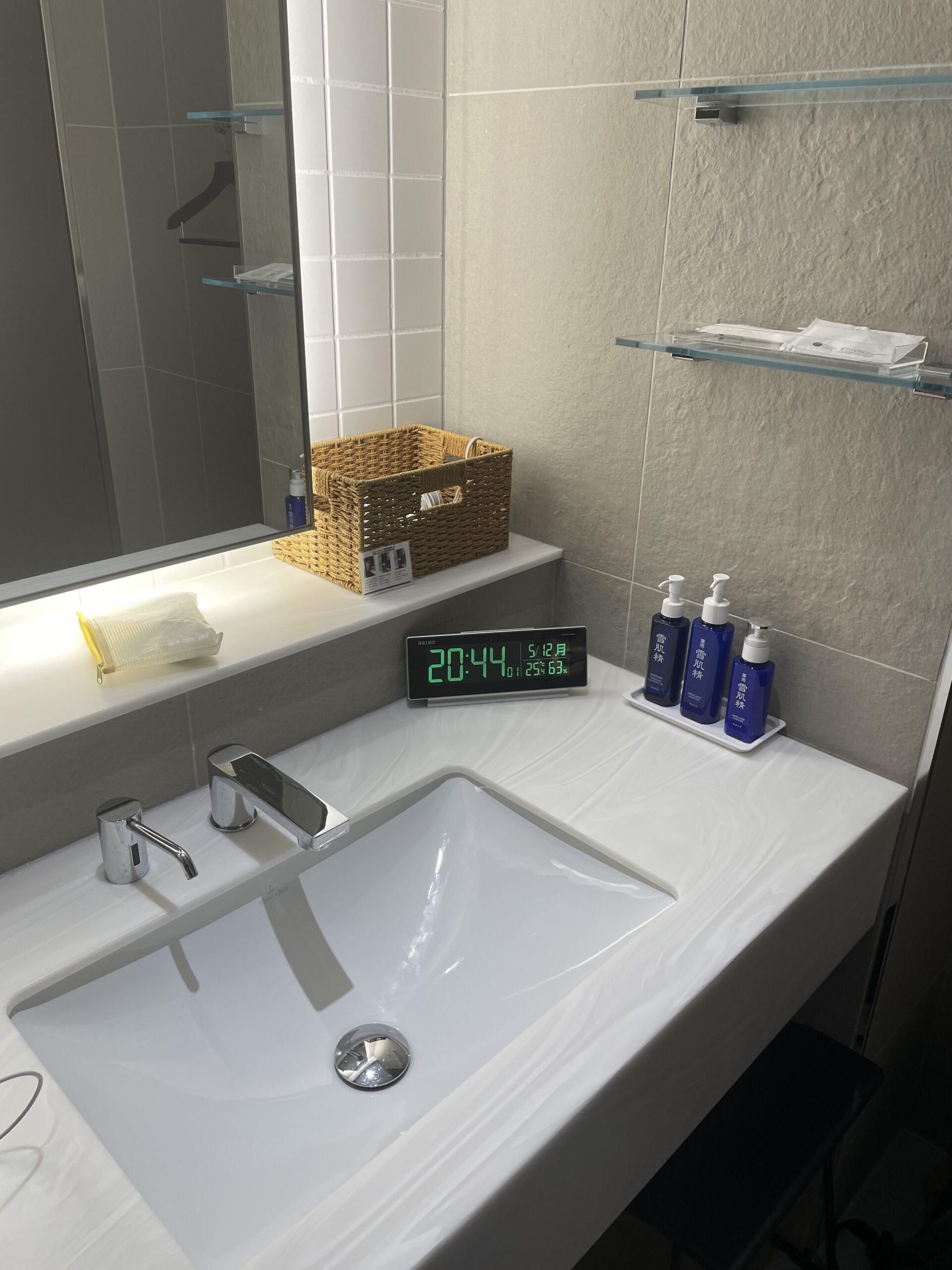 洗面台の片隅にはデジタル時計があるので、時間制限もここで確認することができます。しかし、30分だったら、身支度も含めるとカツカツだと思うのですが、利用されている皆さんは一体どうなんでしょうね…。