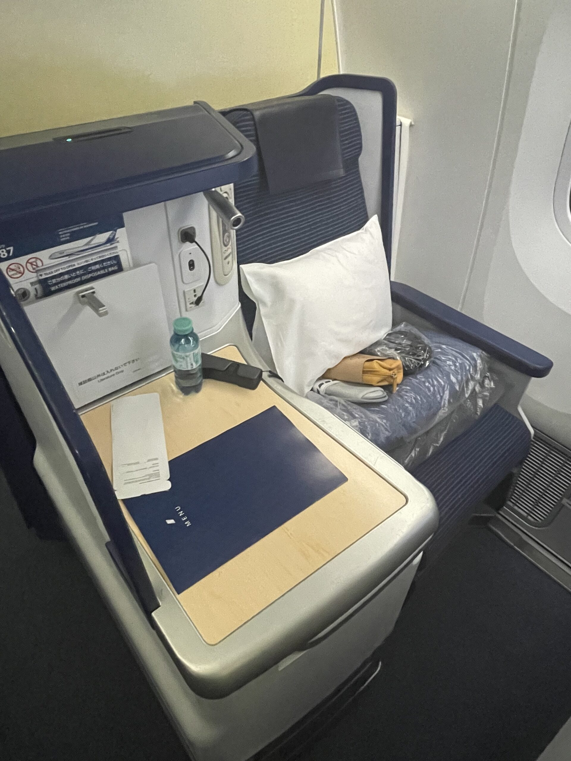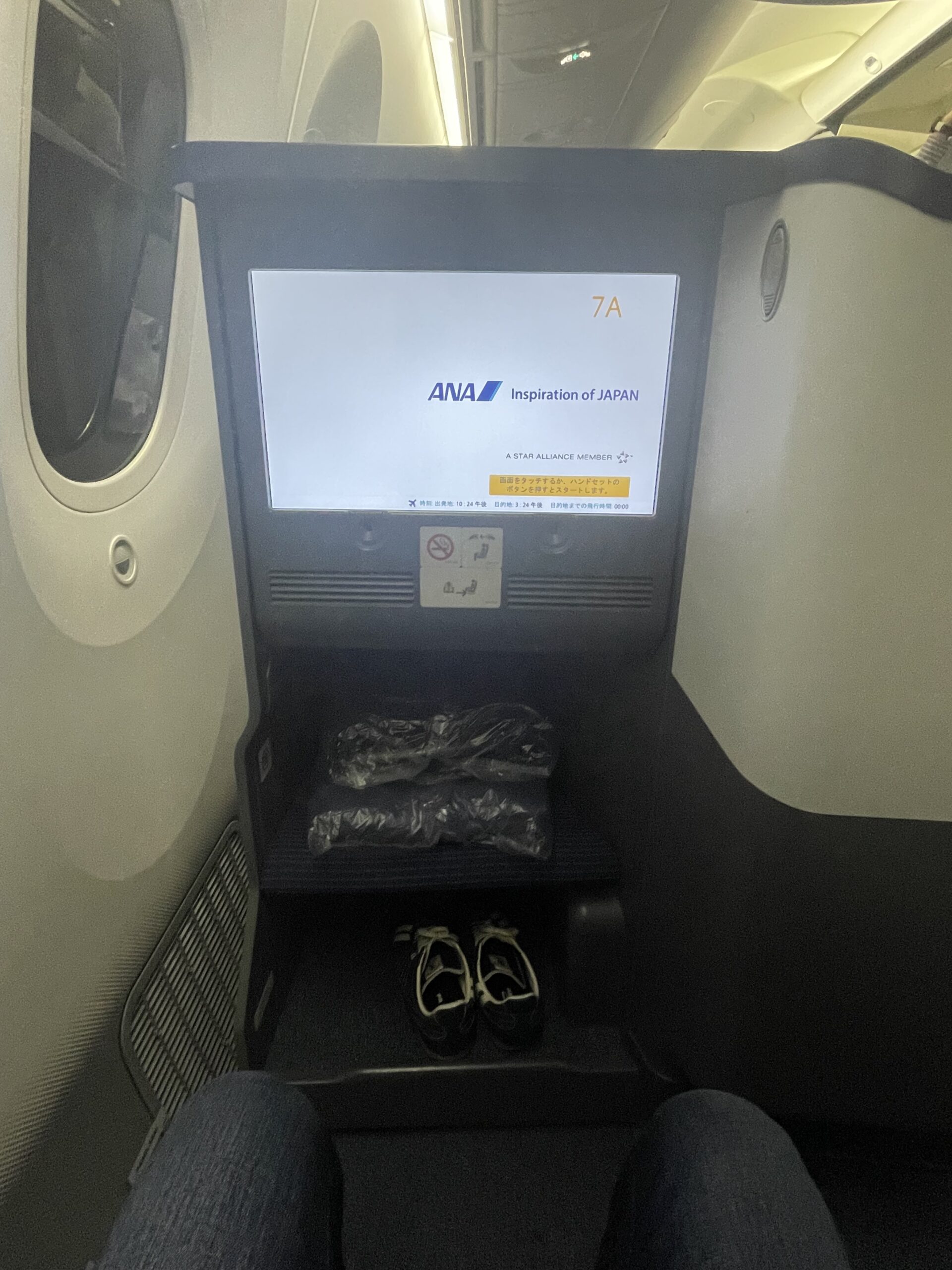 今回の寝床は、左の窓側の7A席。ANAの787-9のビジネスクラスは、1-2-1のスタッガードシートで、窓側は座席が千鳥配置で、窓に寄っているもの、通路に寄っているものがありますが、7Aは窓側寄りです。事前指定のときにここが空いていたので、抑えました。