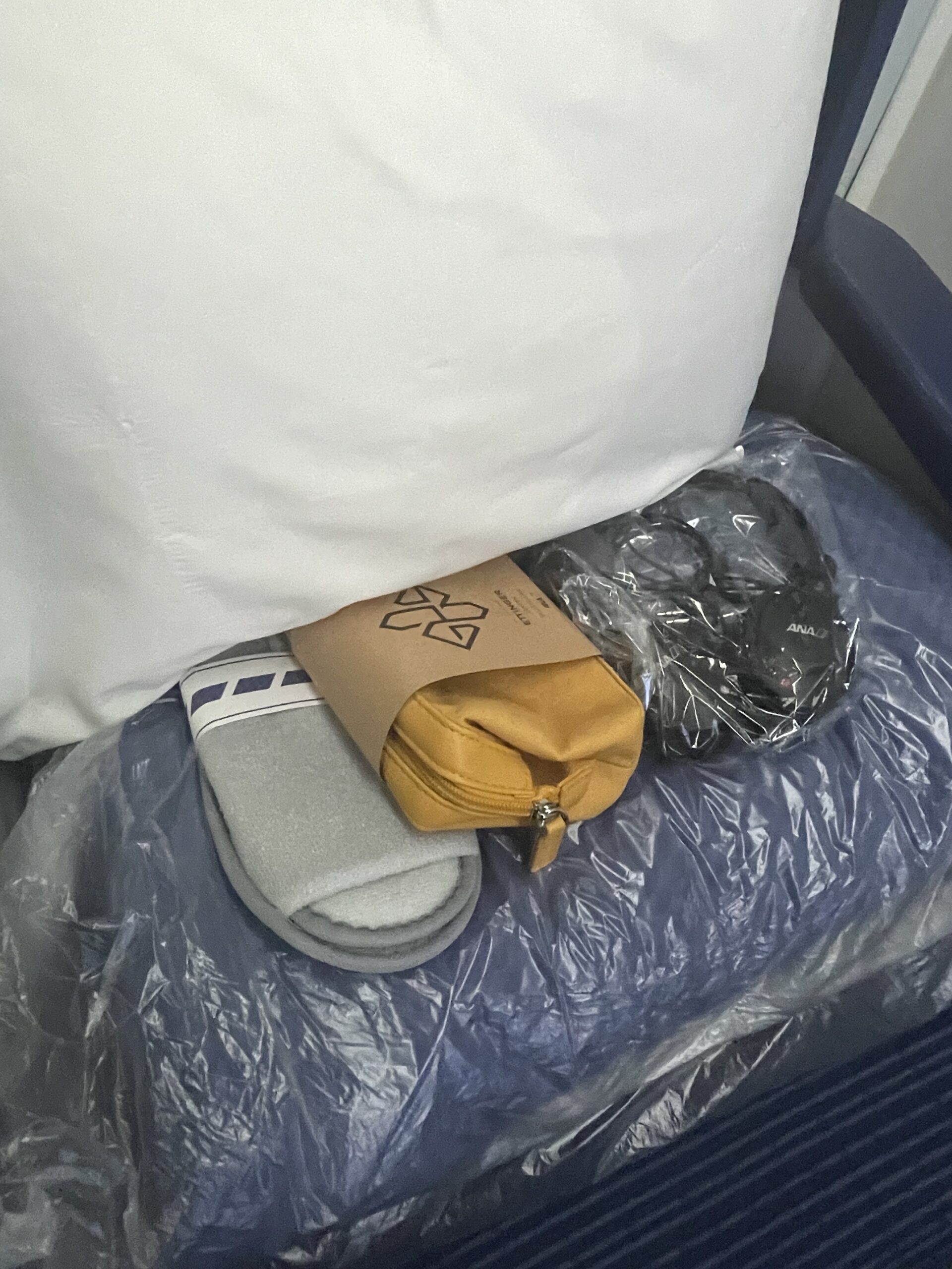 座席には、イヤホン、ポーチ、スリッパ、寝具一式が配置。ポーチの中にはリップクリームと保湿クリーム(?)があっただけだったように思います。余談ですが、2020年にKLMとエールフランスのビジネスクラスを利用したときは、もっと色々と入っていた気がするんですが、パンデミックで変わってしまったのかもしれません。