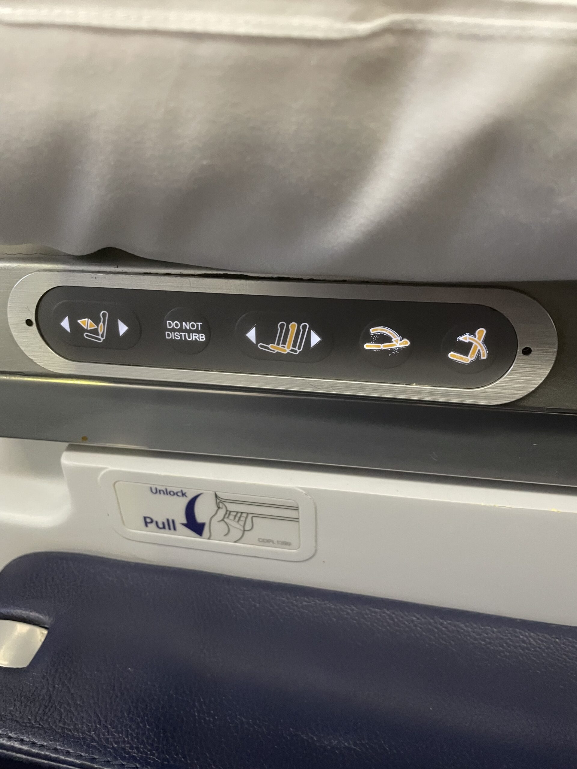 さて、1列席は、通路側だと人の動きが気になるかなと思ったので、必然的に窓側寄りの座席を選ぶのですが、ここしか空いていなかったように思います。このすぐ背後がお手洗いで、人の出入りが少し気になるかなと思ったのですが、深夜便なので特に気になりませんでした。