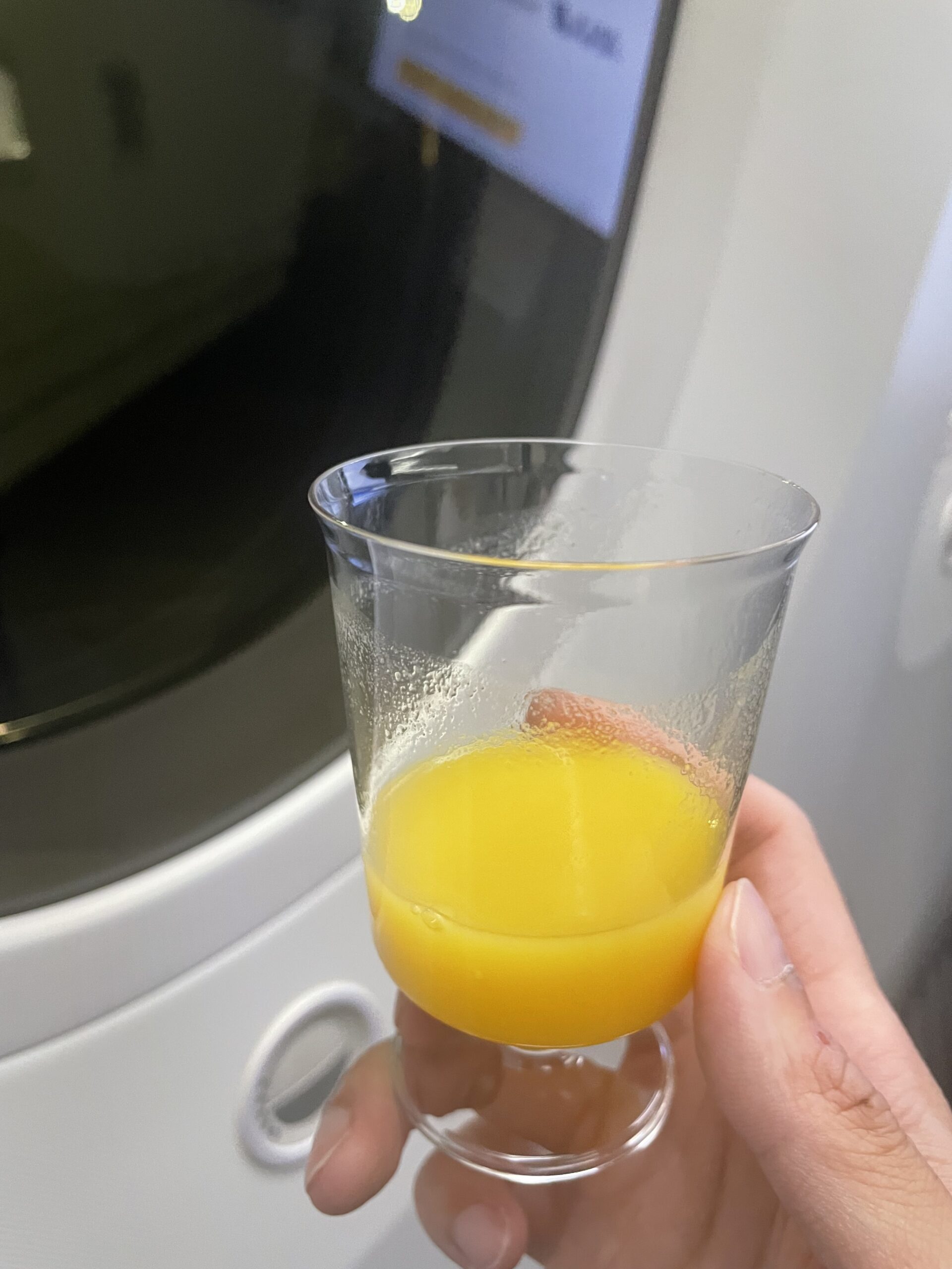 ウェルカムドリンクは、シャンパンとオレンジジュースから選べました。飛行機に乗り込んだ時点で22時半を回っていて、シャンパンを飲む気になれなかったのでオレンジジュースを選択(一口、口に入れてから写真の撮り忘れに気付いたので、写りが悪い写真ですが、ご勘弁を…)。