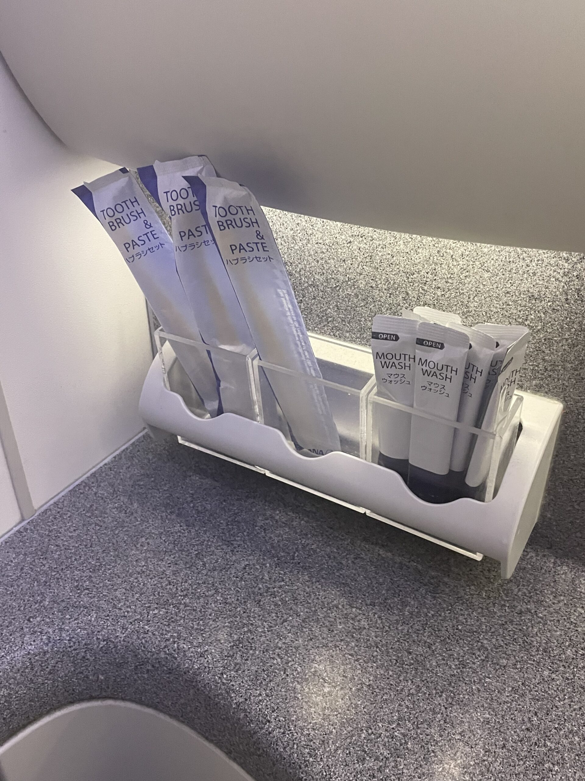 これはビジネスクラス限定なのかよく分かりませんが、マウスウォッシュは普段使っているので、これは本当に有難かったです。
