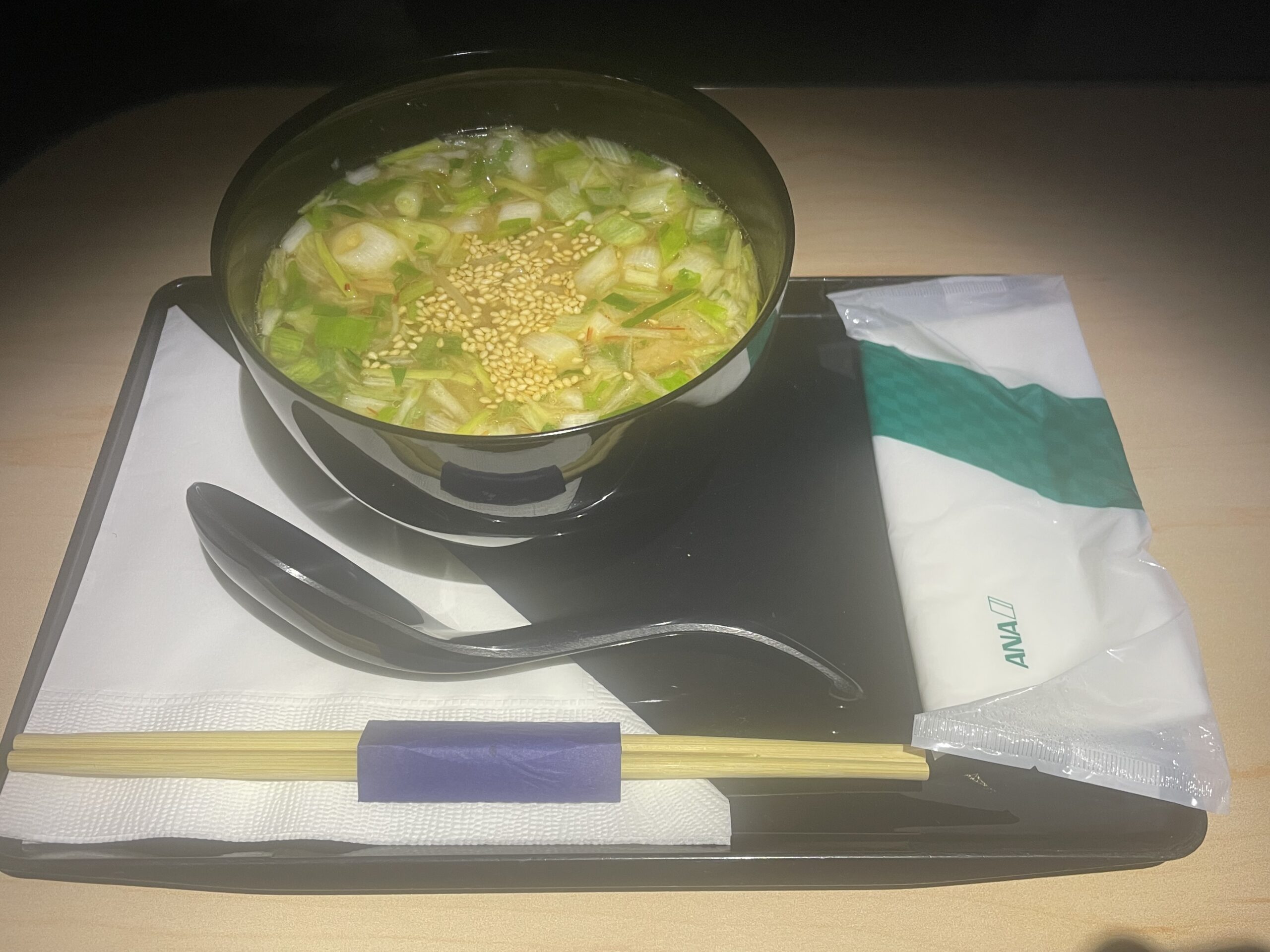 今は、日本発と海外発とでメニューが違っていて、日本発は味噌ラーメン、海外発は豚骨風ラーメン(麺は恐らく同じ)となっています。ANAのラーメンと言えば一風堂改修、というイメージが強いですが、リブランドされて一風堂とは関係なくなった?のかもしれません。