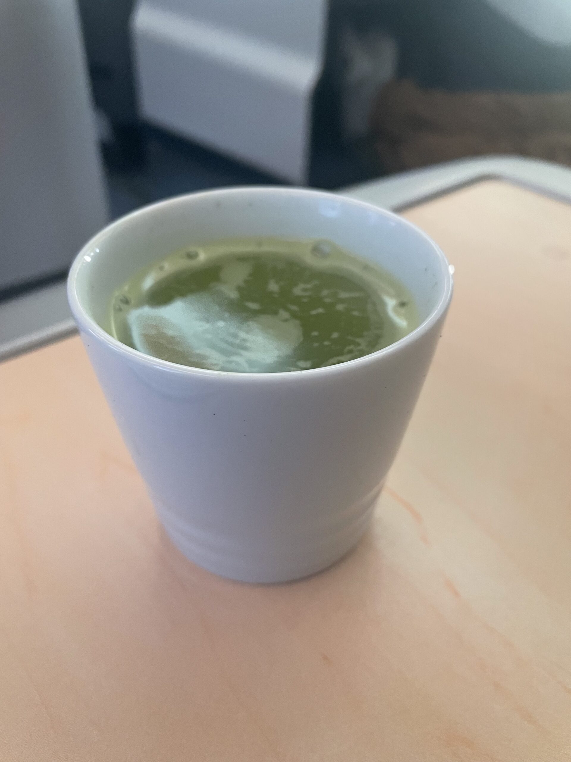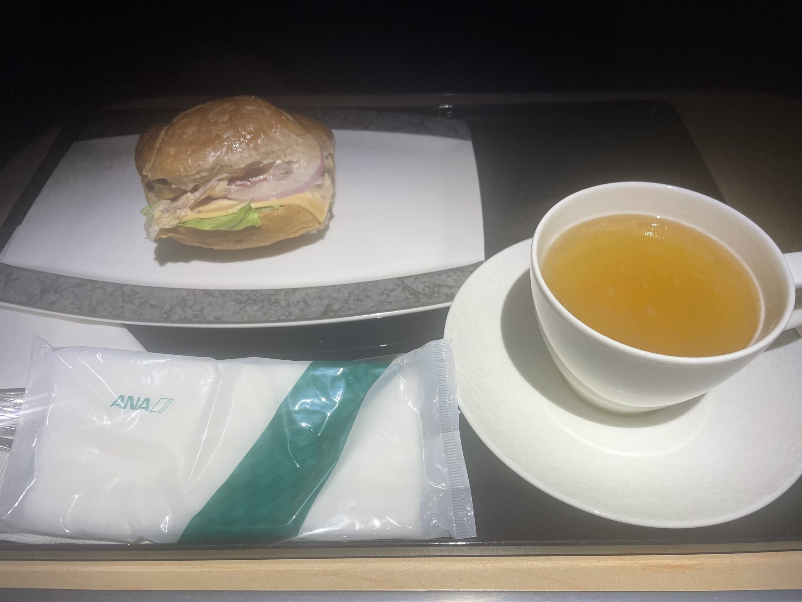 また、着陸前には、温かい静岡緑茶もいただきました。日系のビジネスクラスを使うのが初めてなのでよく分かっていませんが、機内で日本茶を飲めるのって日系だけでしたっけ。日本発での海外旅行レベルだとそこまでありがたみを感じないとは思うのですが、海外生活などで、日本の食事から長いこと遠ざかっていると、こういう一杯が胃に染みるんだろうな、と思いました。