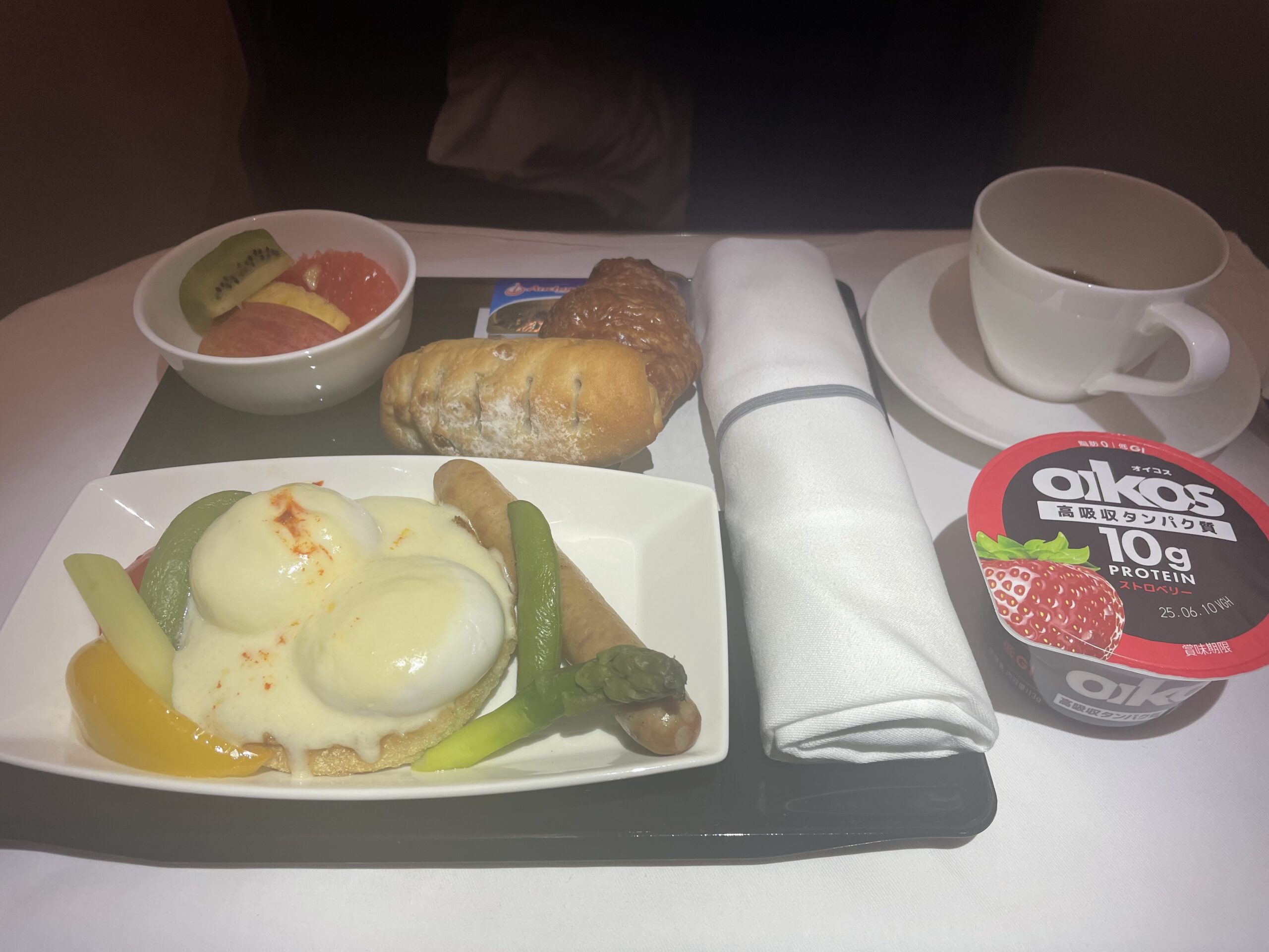 着陸の2時間くらい前になると、機内の消灯も終わり、朝食がサーブされました。朝食も和洋(洋は更に、イングリッシュブレックファーストとコンチネンタルの2種類)から選べましたが、ここはイングリッシュブレックファーストを選択。