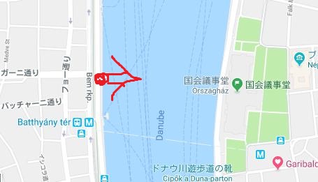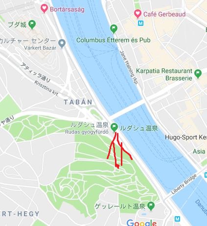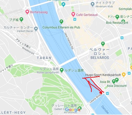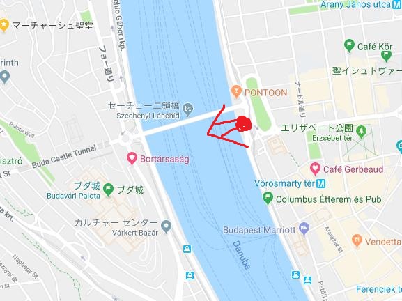 地図の縮尺が小さいので分かりづらいですが、ポイントは「自由橋の上から眺める」ということ。ペスト側の河岸からだと、手前に船があるのと、エリザベート橋が王宮を隠してしまいます。