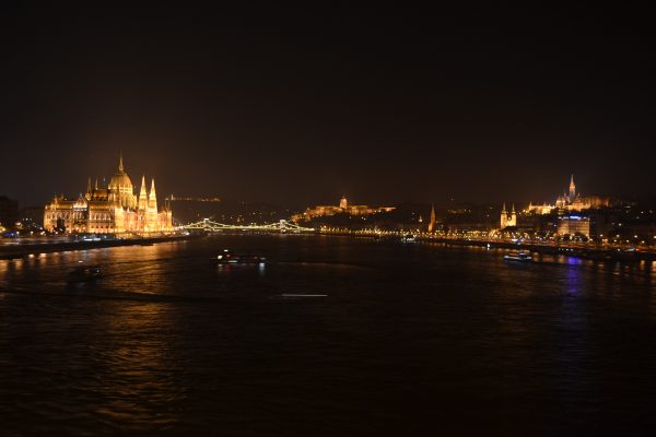 実は、このマルギット橋から南を望んだときに、ドナウ川両岸の建物を全て1つのフレームに入れることができるんですね。距離の関係で、全ての建物の存在感を際立たせることはできないのですが、議事堂は照明の量が桁違いなので中でもひときわ輝いて見えます。